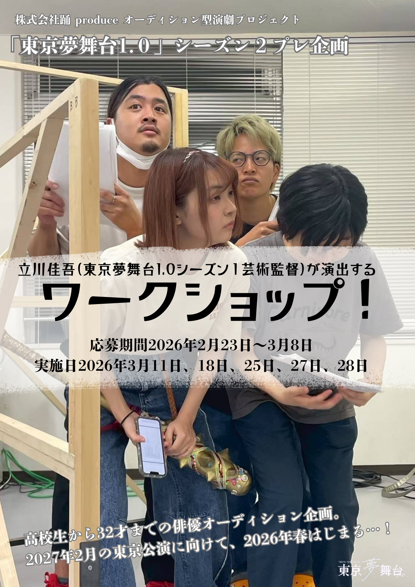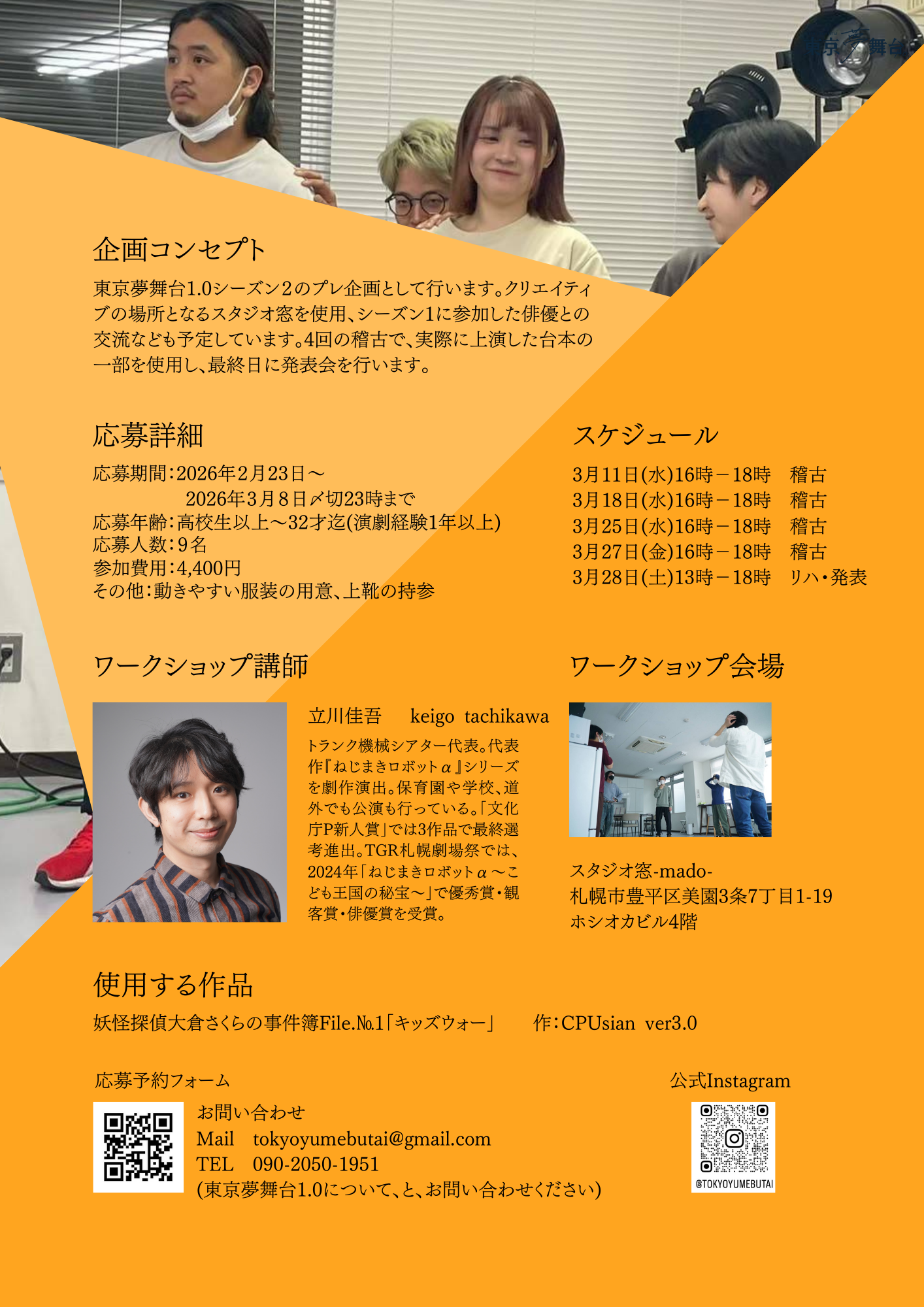 シーズン1で芸術監督を務めた、立川佳吾さんが開催する発表会付きのワークショップイベントです。取り扱う作品は、東京夢舞台1.0×North Live Companyがコンセプトにしている音楽劇、殺陣芝居、などの作品群から「妖怪探偵大倉さくらの事件簿」シリーズを使用します。